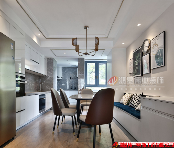 廚房和西廚的區(qū)域,空間不是很大,但是功能很強,西廚有設(shè)計烤箱、洗碗機、冰箱、操作臺,在吃飯之前洗個手,切個水果很方便。餐廳的卡座是定制的,因為餐廳的寬度不夠 所以設(shè)計了卡座來節(jié)約餐廳的空間,減少過道區(qū)域。
